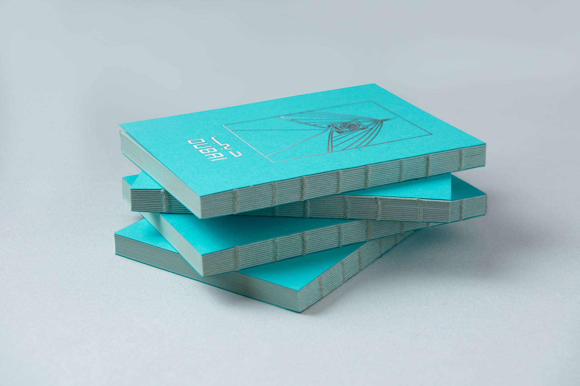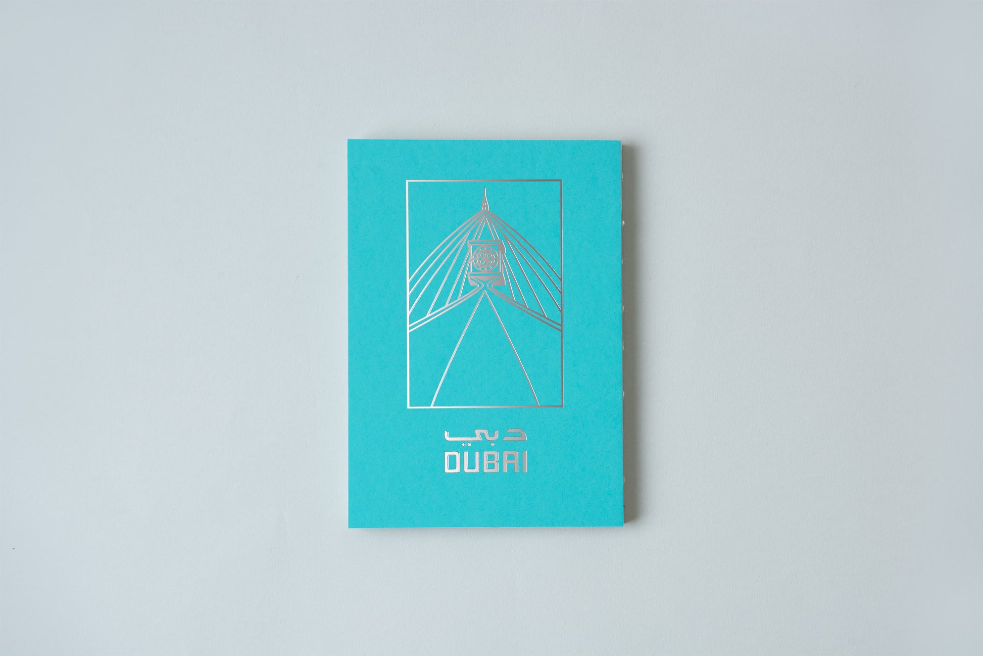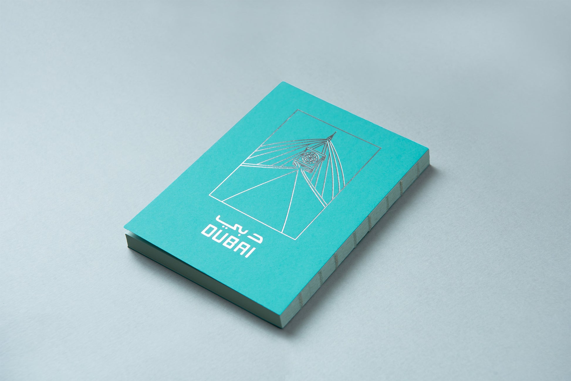 A6 paper notebook with a soft cover and lined, colored pages for capturing everyday inspirations and thoughts. The exposed binding spine allows for comfortable writing and convenient use. Featuring a foiled design specially created for Dubai, these notebooks highlight nostalgic and historic landmarks that reflect the emirate's rich heritage.