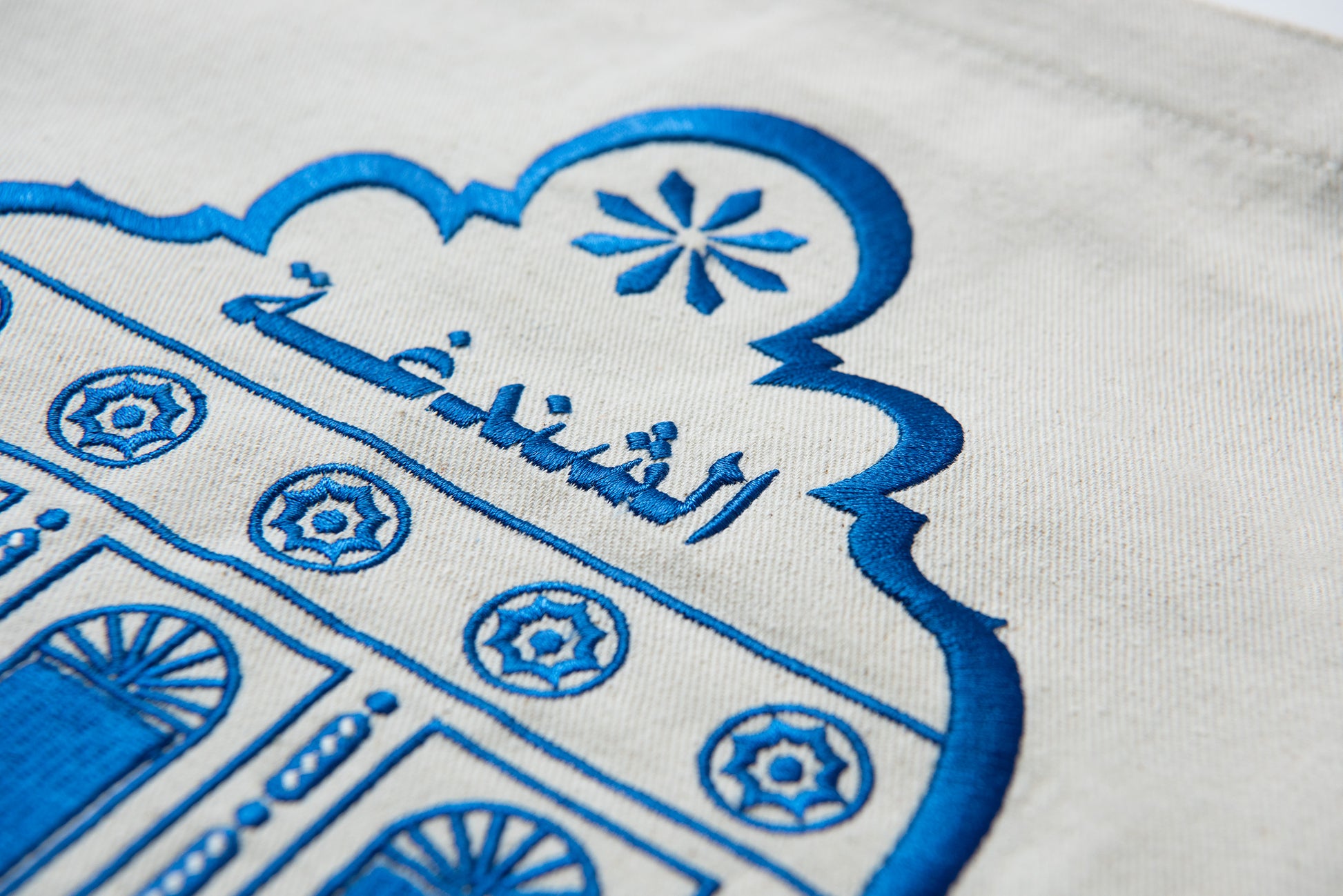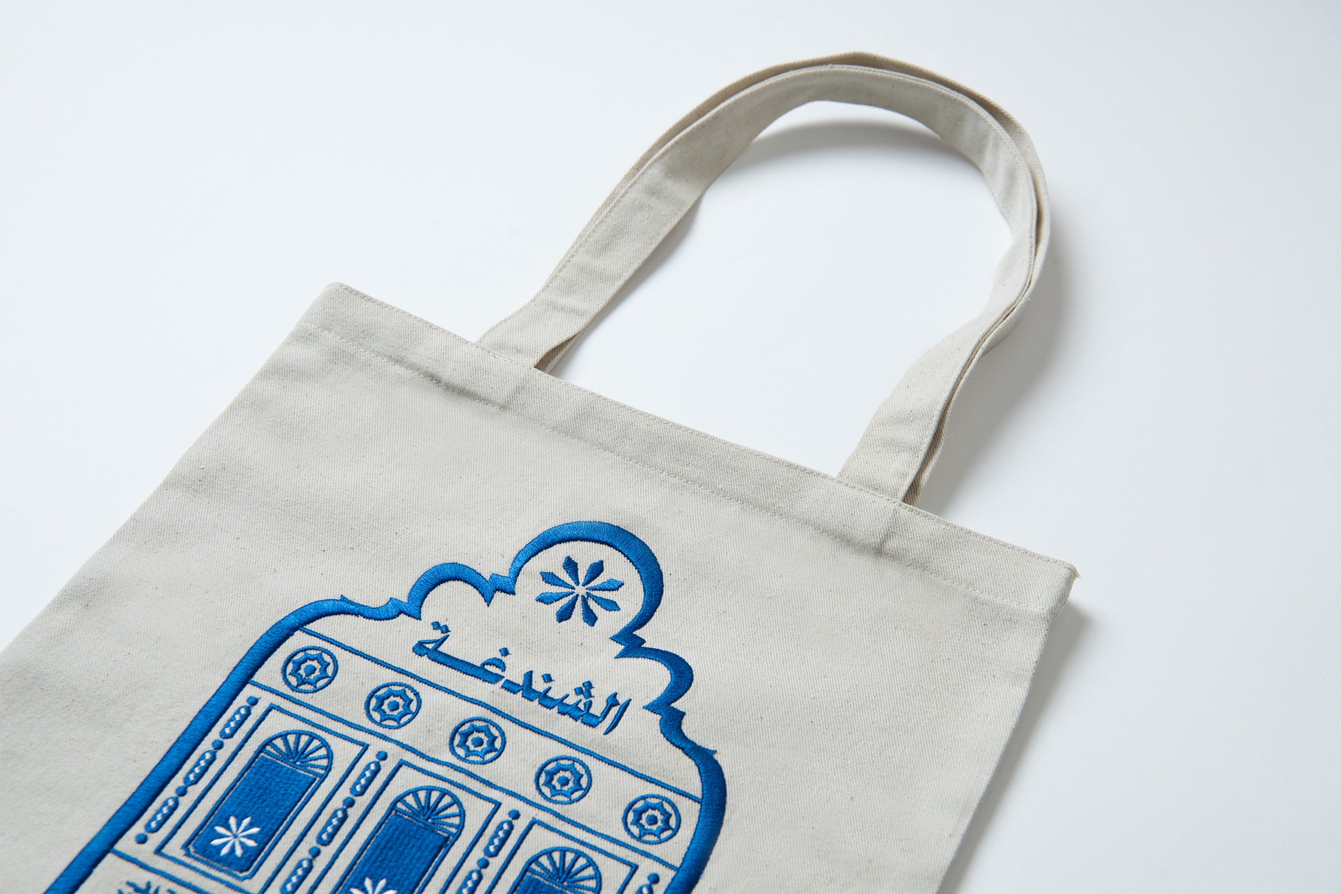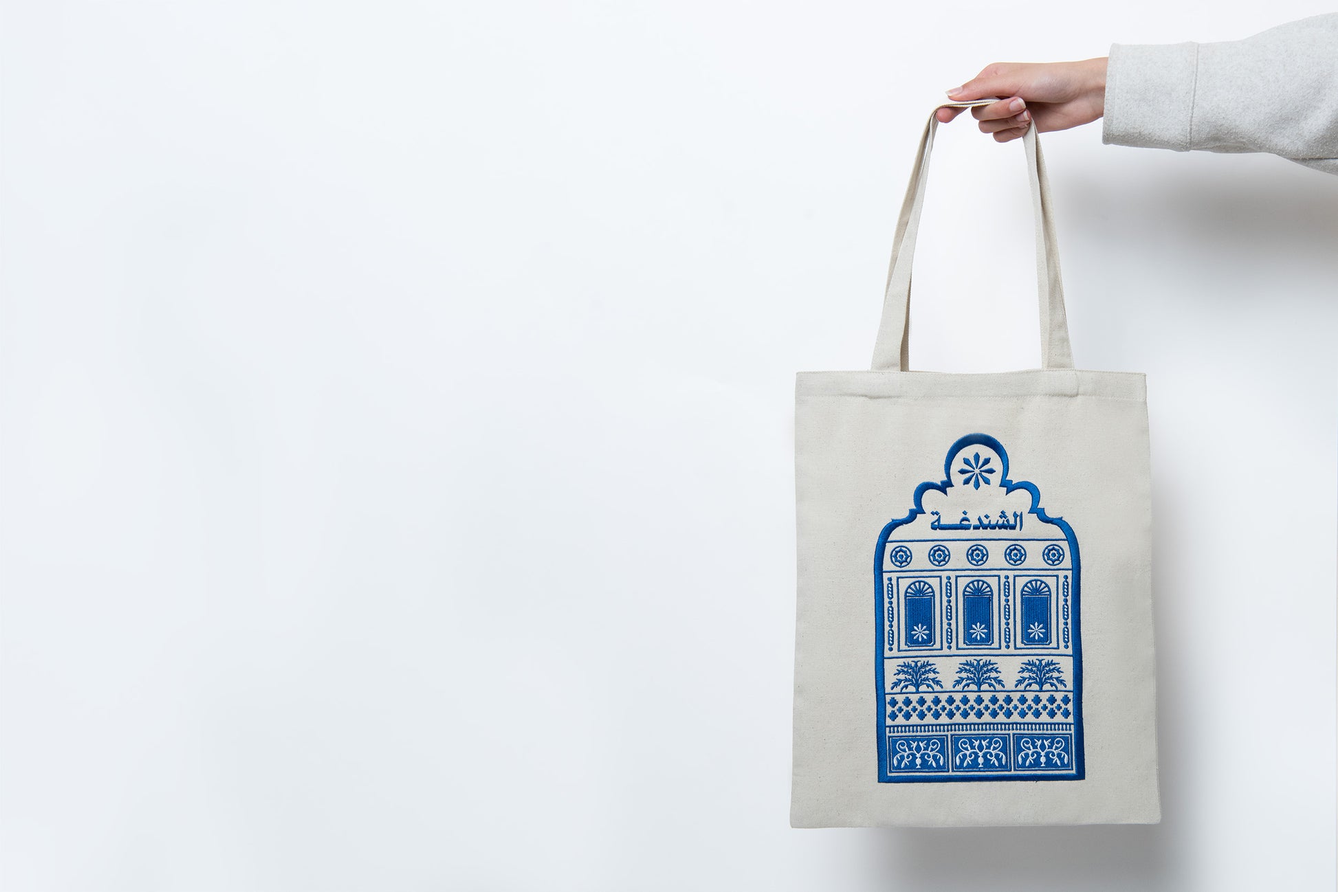 This canvas tote bag features an embroidered artwork of Al Shindagha on the front, celebrating the heritage of the historic area.