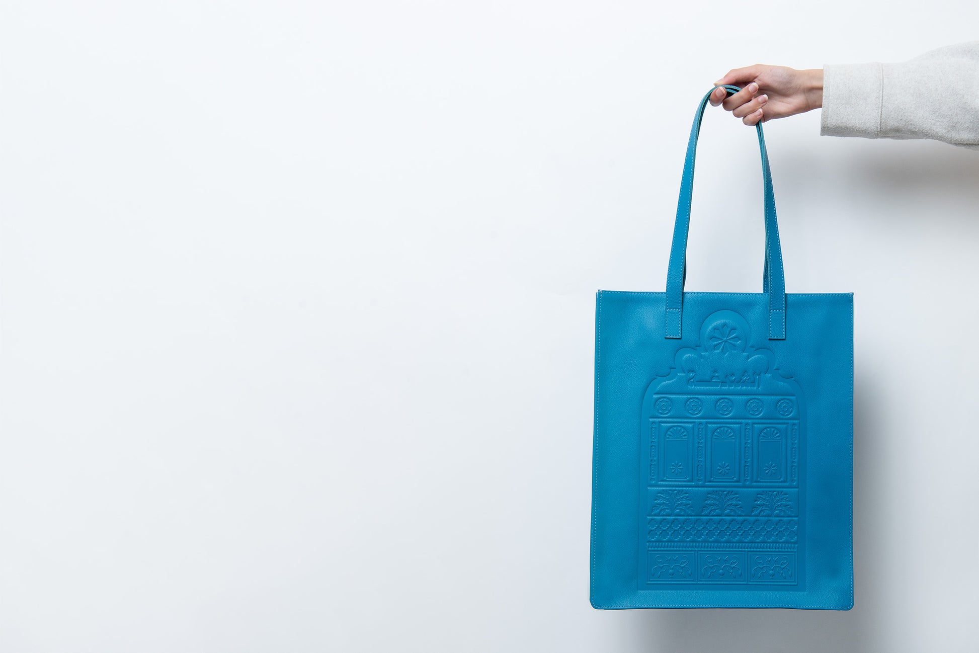 This shopping tote builds on a minimal design with blind embossing featuring architectural and historical landmarks from the area Alshindagha