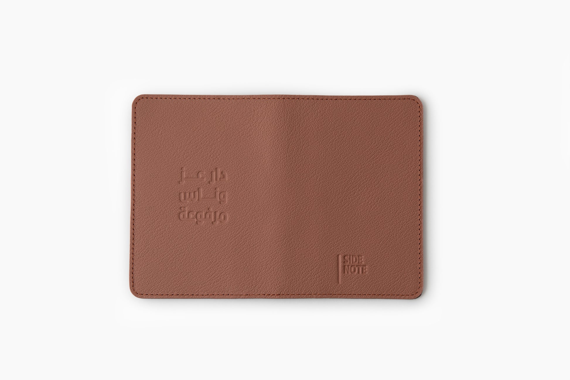 A soft camel leather passport holder featuring an embossed quote of the late Sheikh Zayed bin Sultan Al Nahyan. The notebooks are embellished with blind embossing of the Arabic phrase: "دار عز وناس مرفوعة". It includes card slots to hold your personal cards alongside your passport and travel documents.