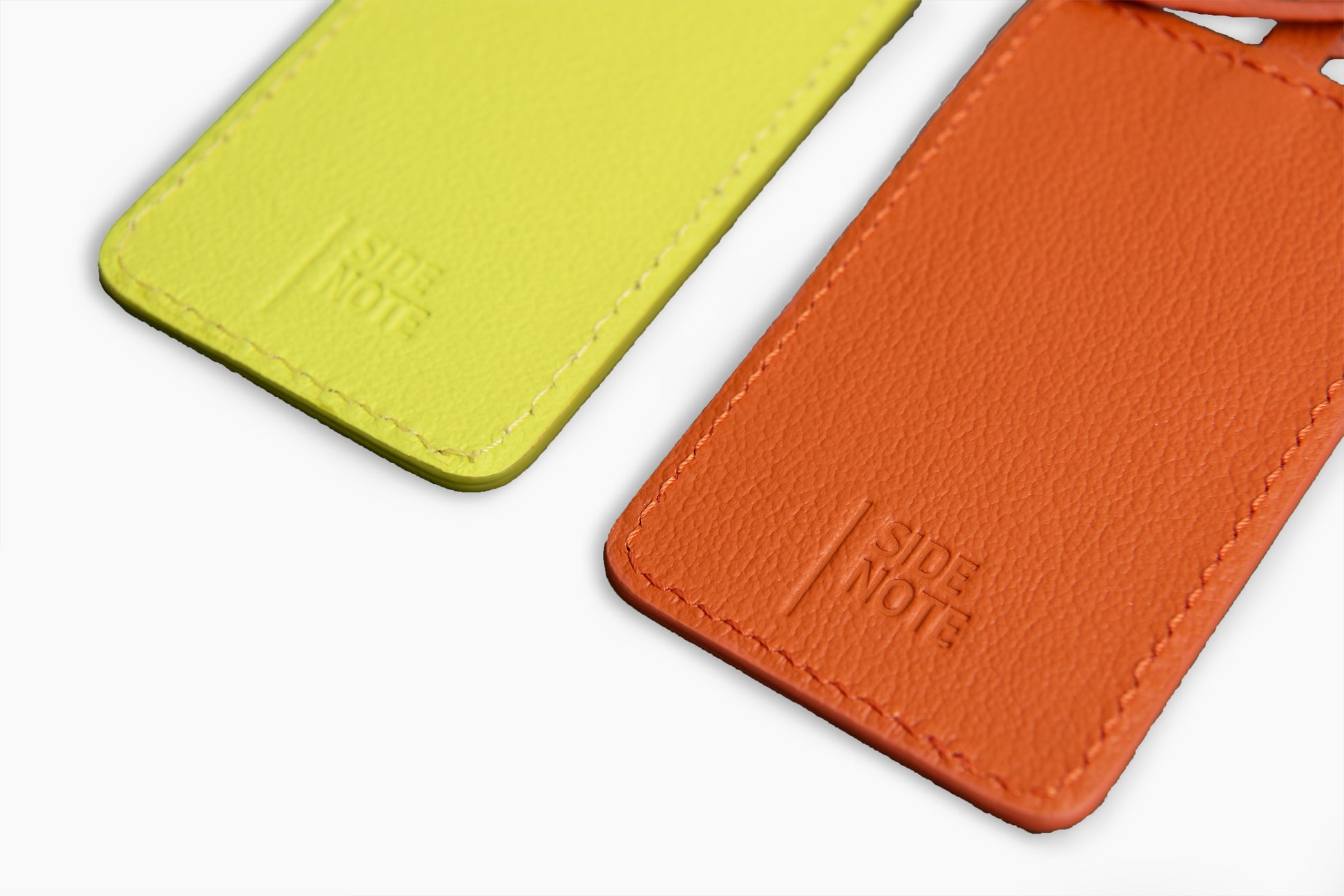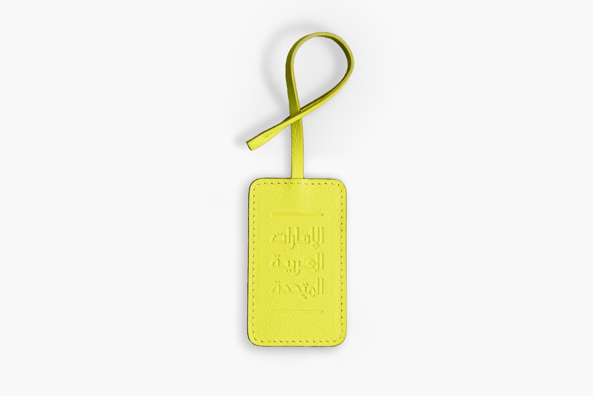 A camel leather luggage tag available in two color options, Burnt Orange and Neon Yellow. The luggage tags include embossed typography of the words "United Arab Emirates."