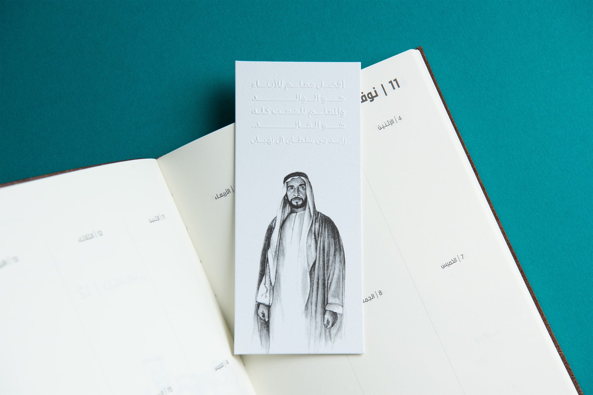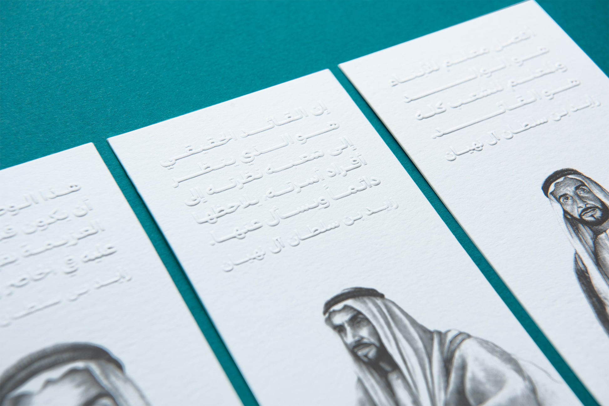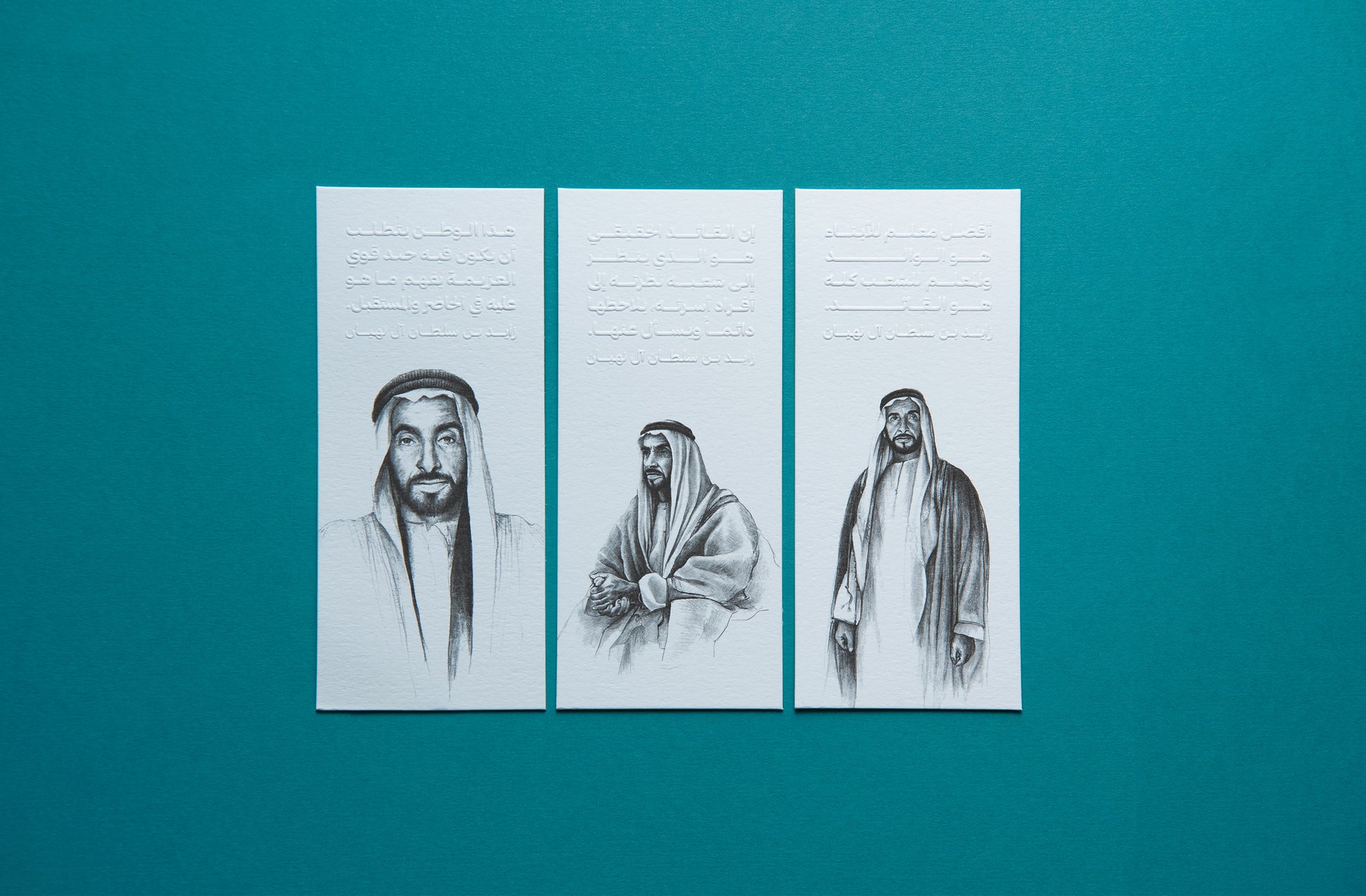 A set of 3 paper bookmarks designed to commemorate our Founding Father, the late Sheikh Zayed bin Sultan Al Nahyan, featuring blind embossed quotes paired with an original artwork.