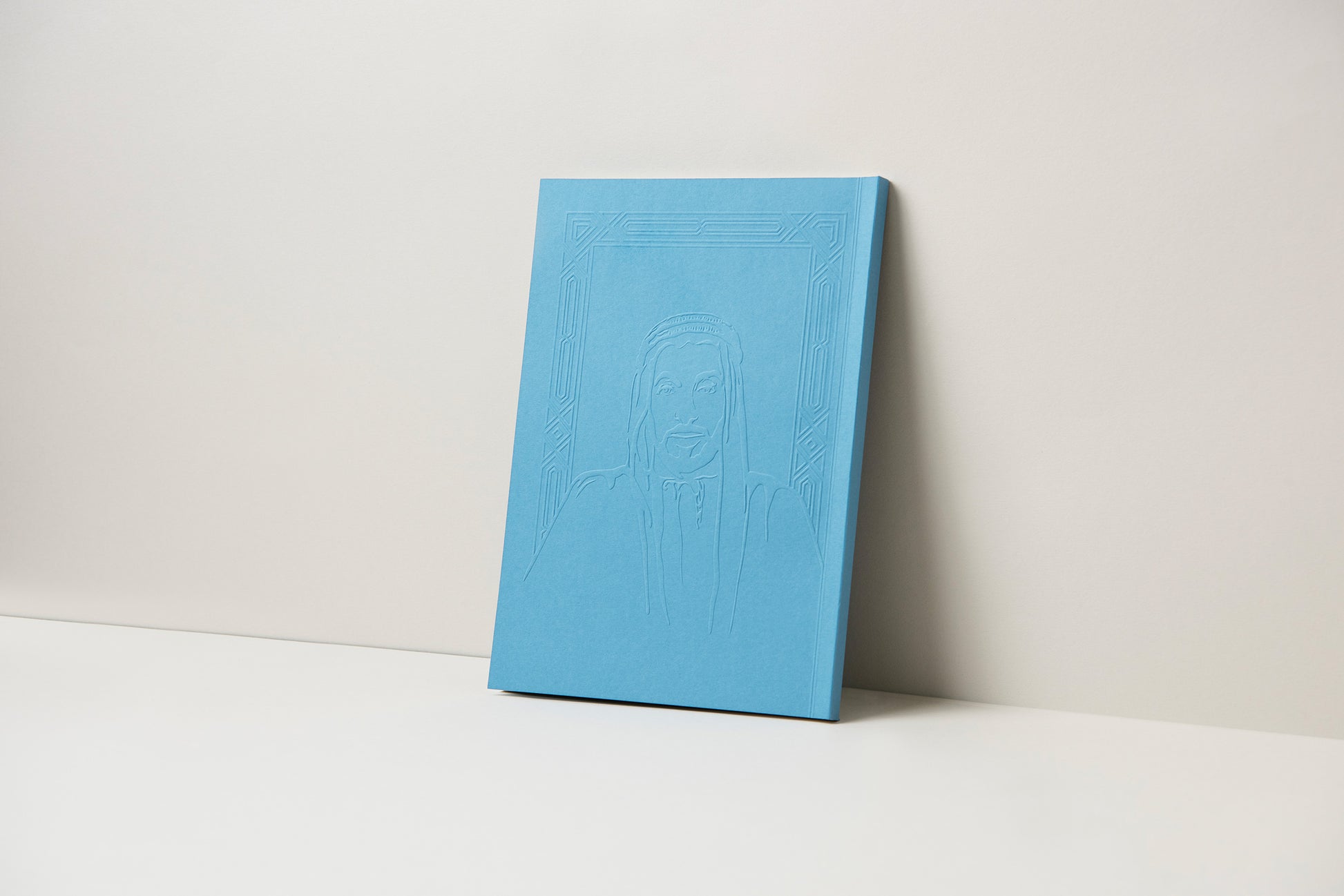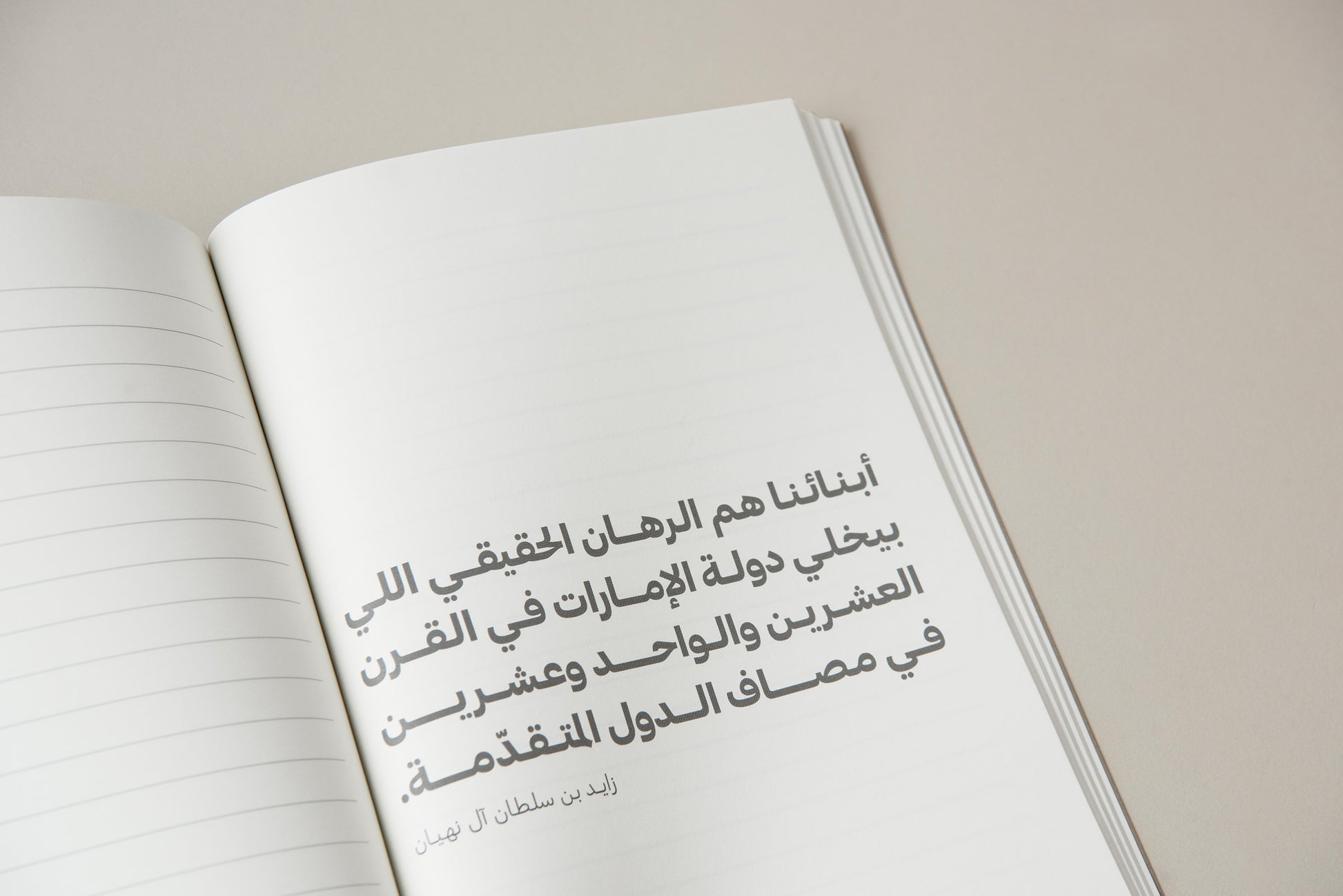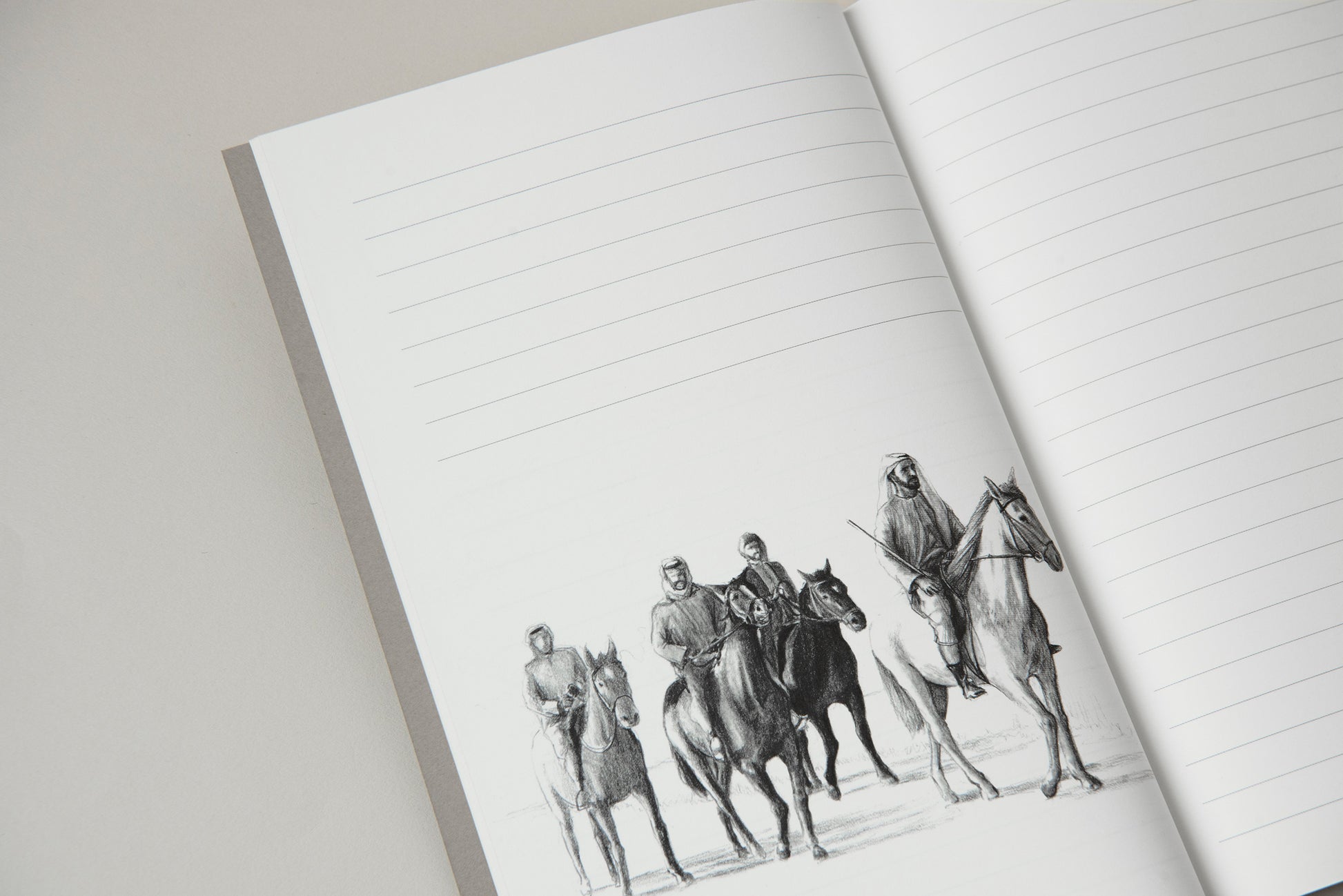 A lined paper notebook of 100 pages designed to commemorate our Founding Father, the late Sheikh Zayed bin Sultan Al Nahyan, featuring 6 original artworks and a quote found within different sections of the notebook.