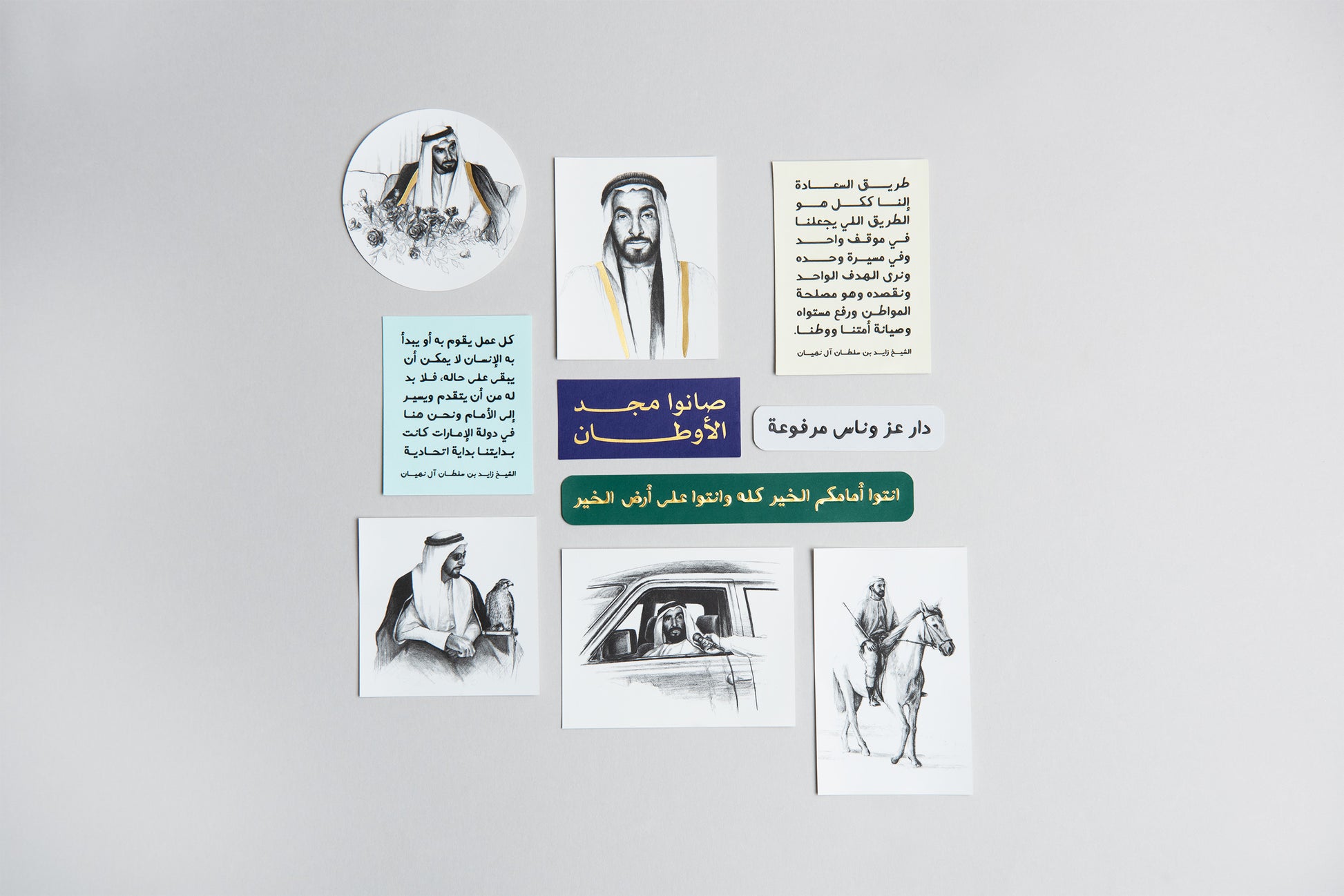 Set of 10 paper stickers portraying the Founding Father, the late Sheikh Zayed bin Sultan Al Nahyan through hand drawn artworks and quotes. The collection of stickers depicts embossing and gold foiling elements.