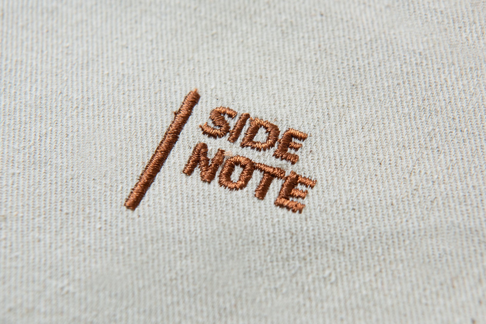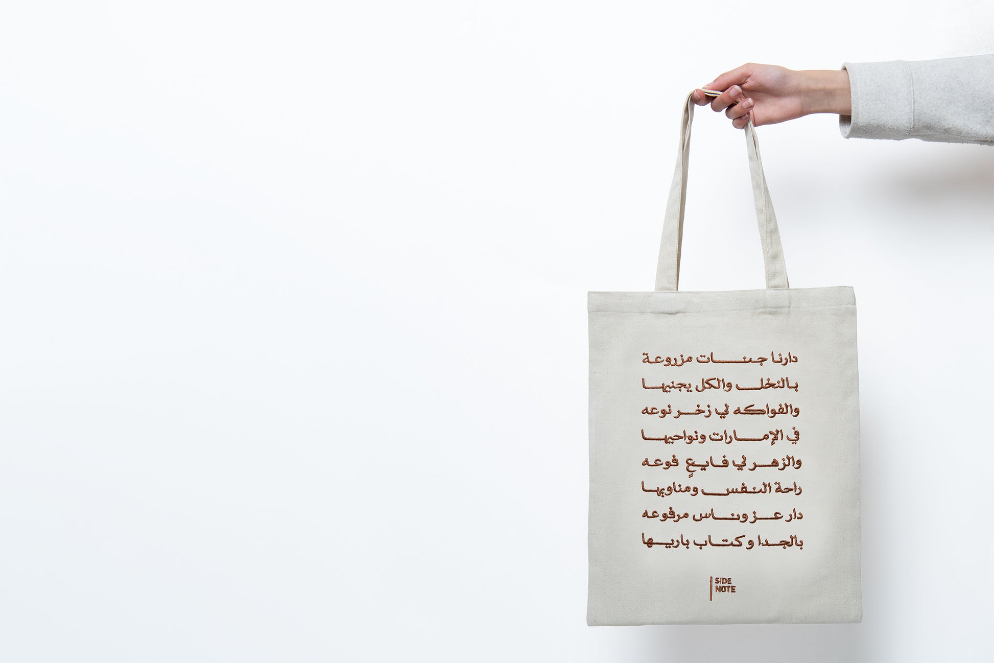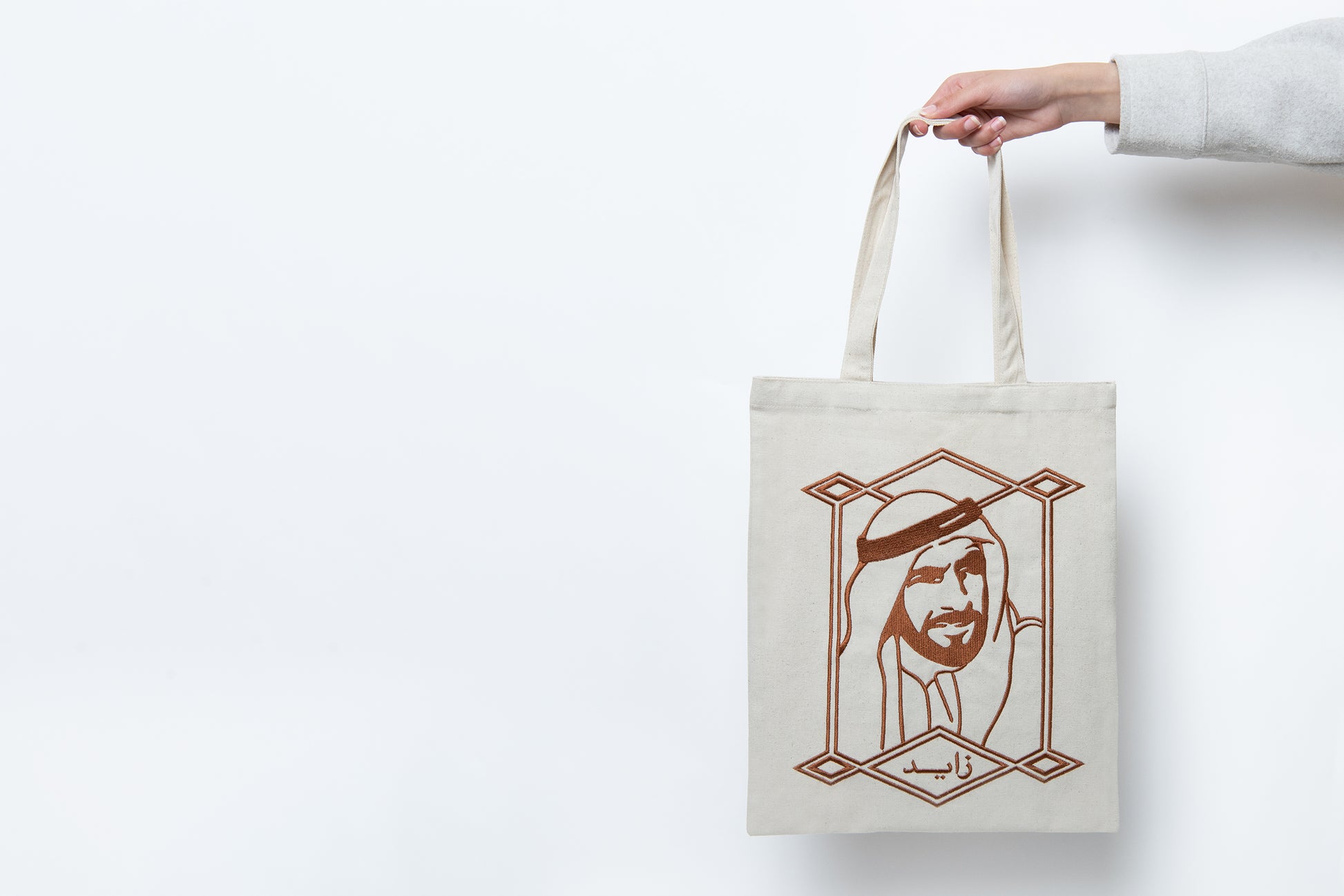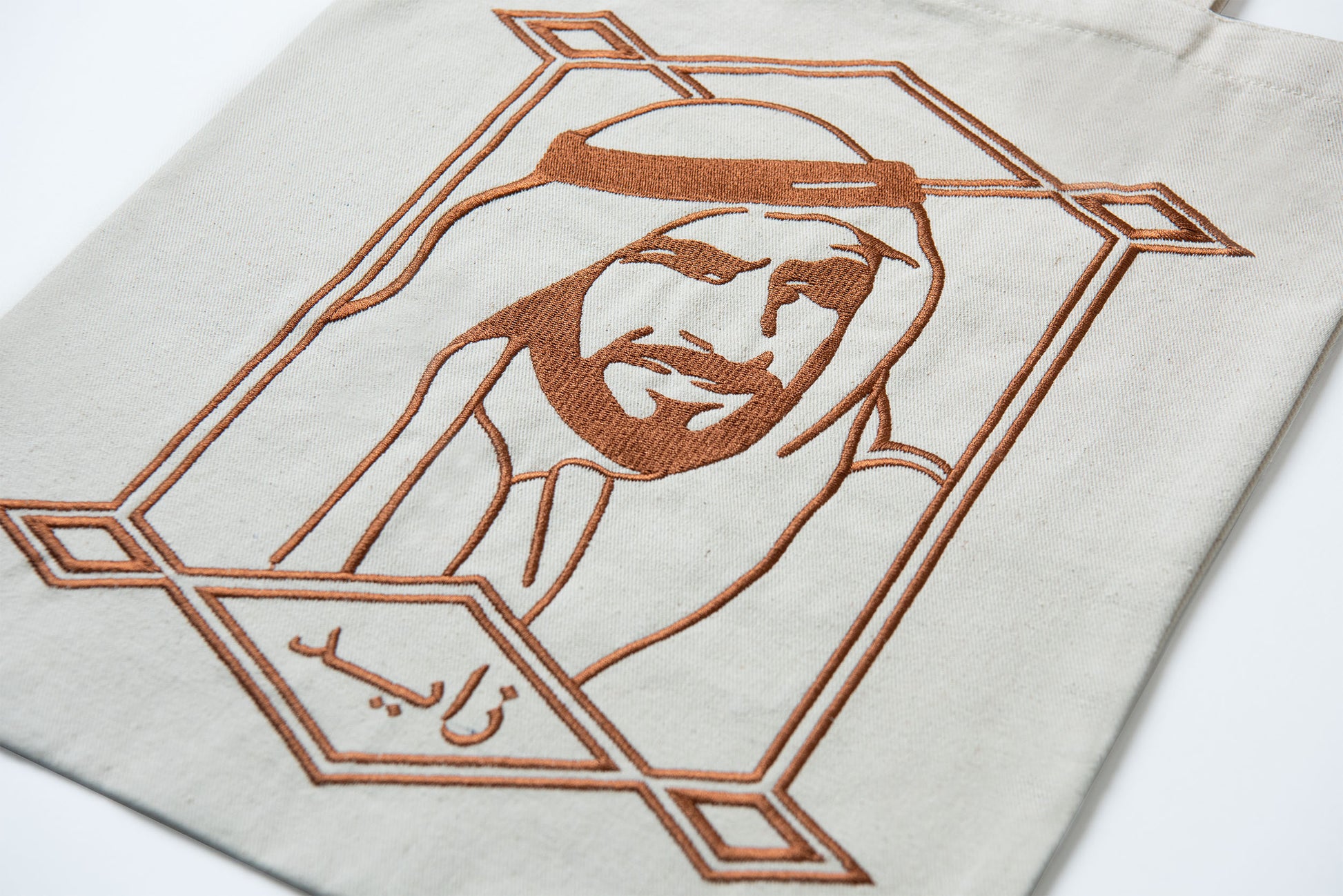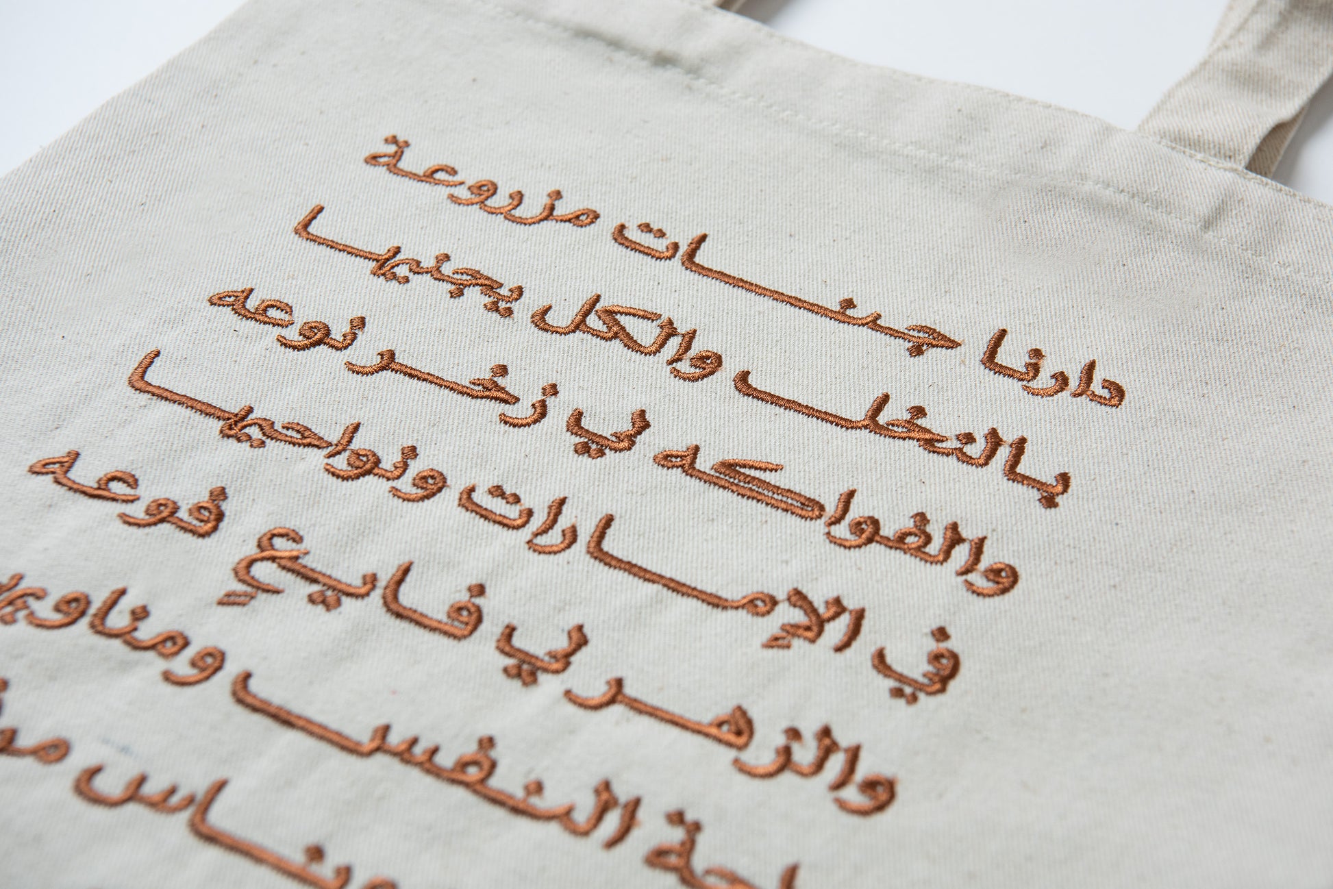 A canvas tote bag Featuring an embroidered artwork on the front and a poem on the back.