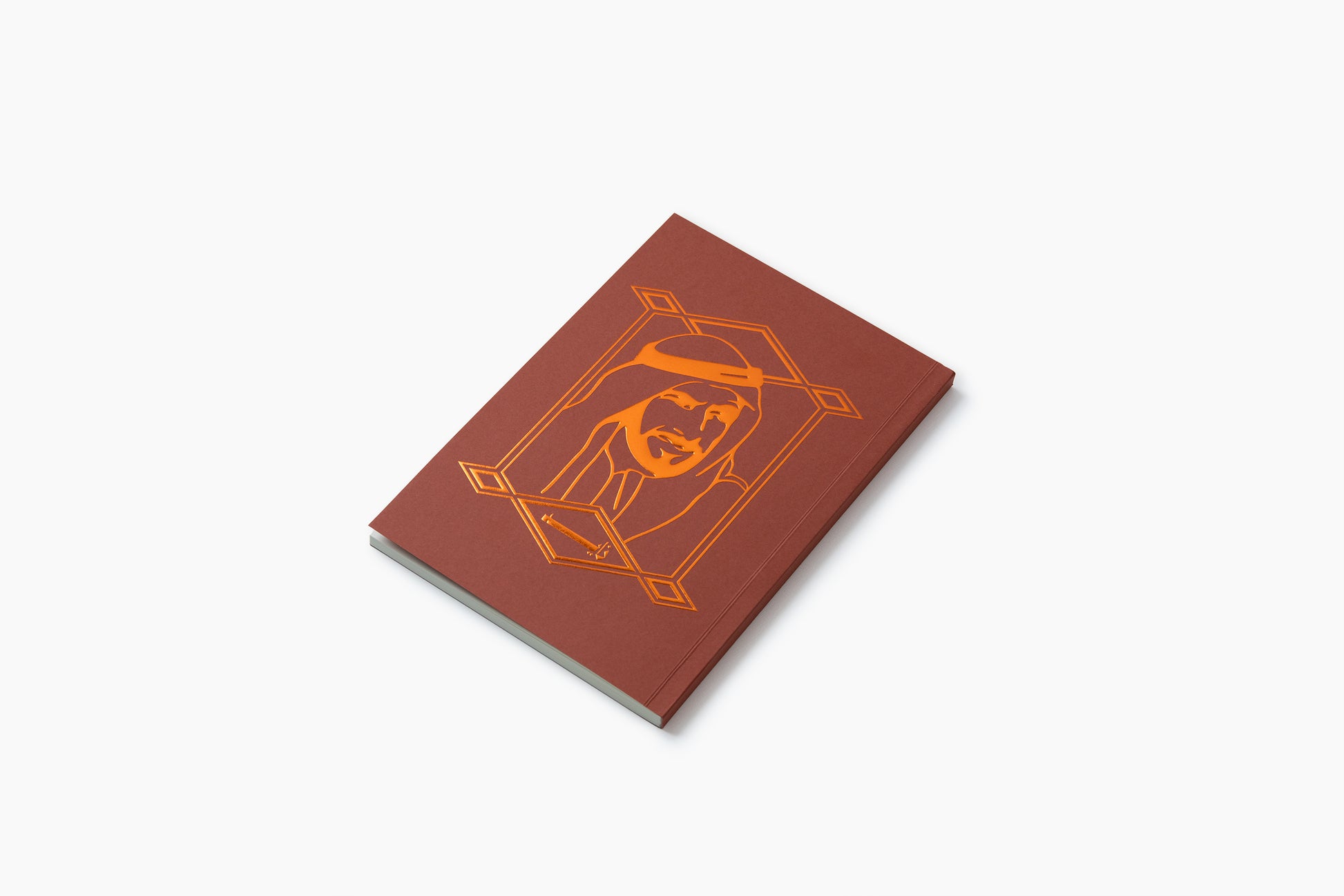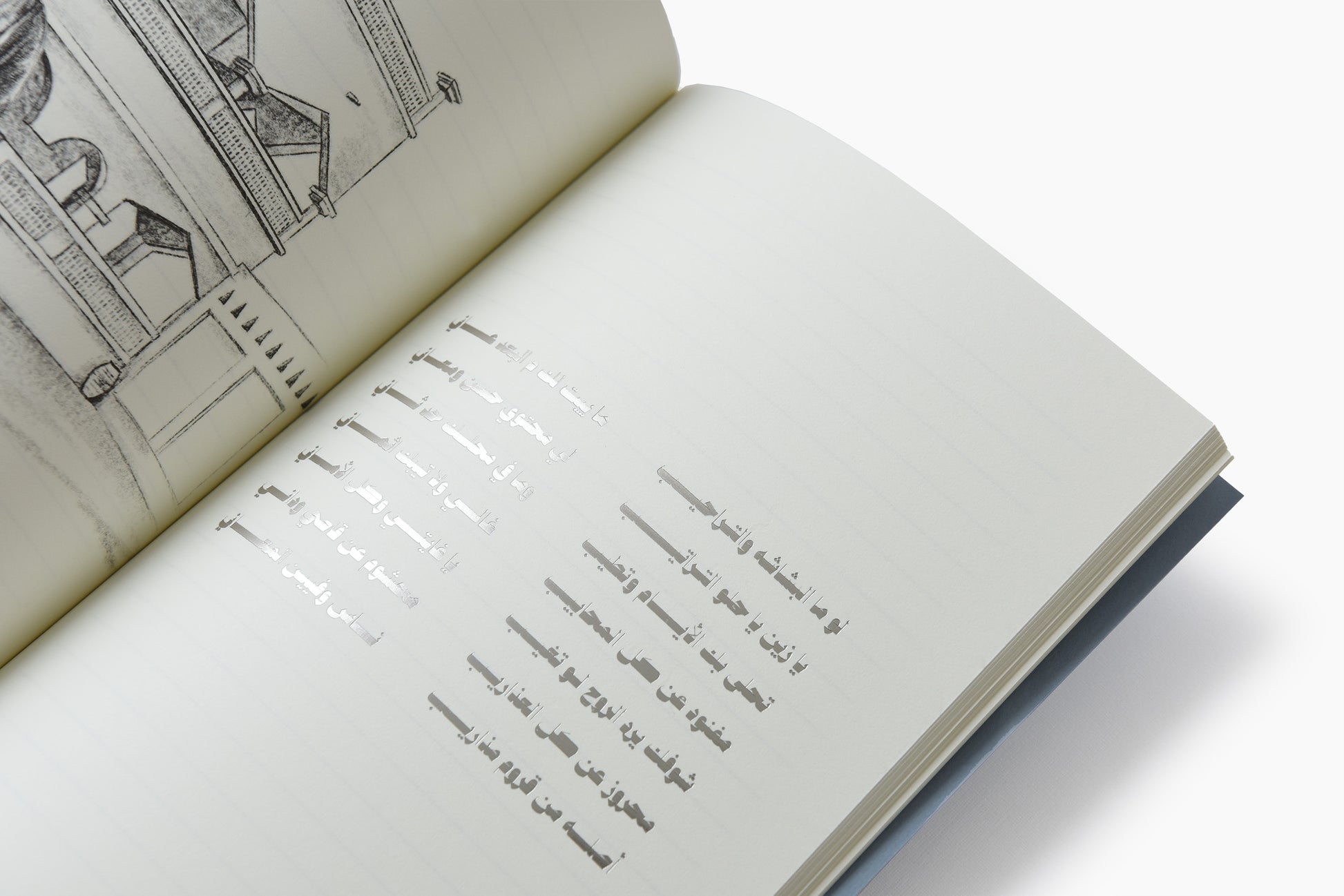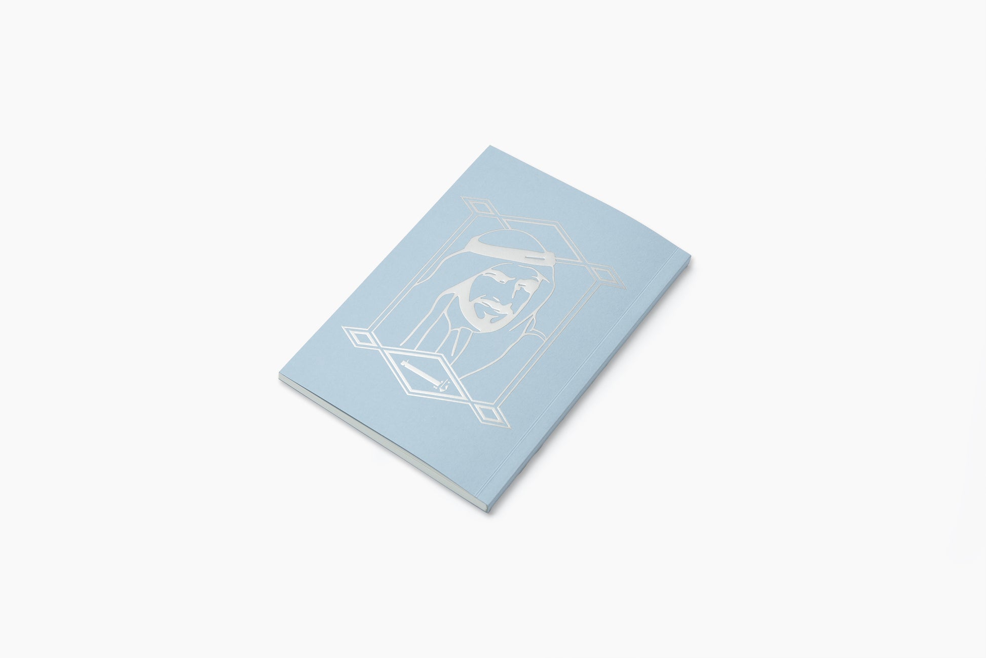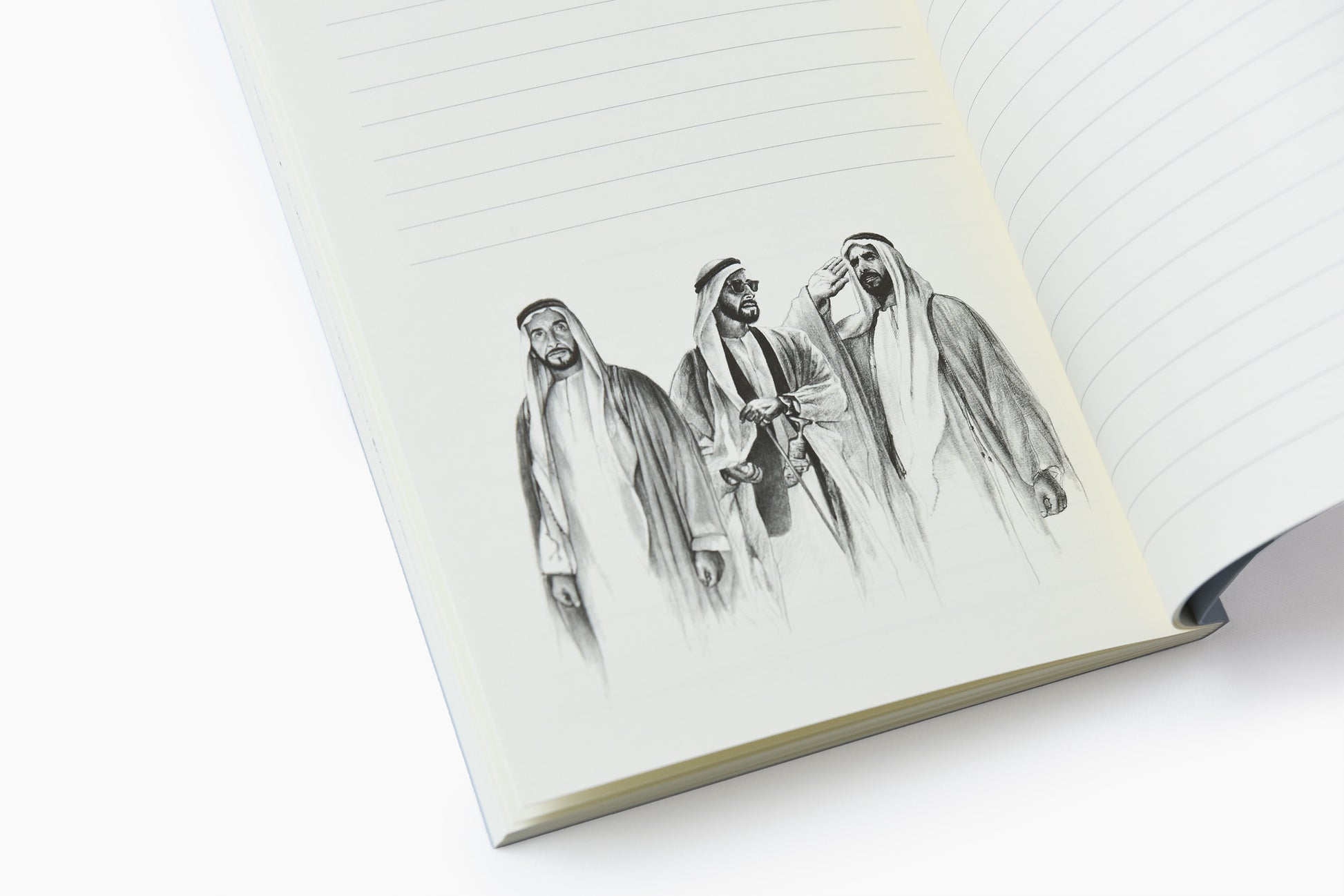 A lined paper notebook of 100 pages designed to commemorate our Founding Father, the late Sheikh Zayed bin Sultan Al Nahyan, featuring artworks and quotes found within different sections of the notebook.