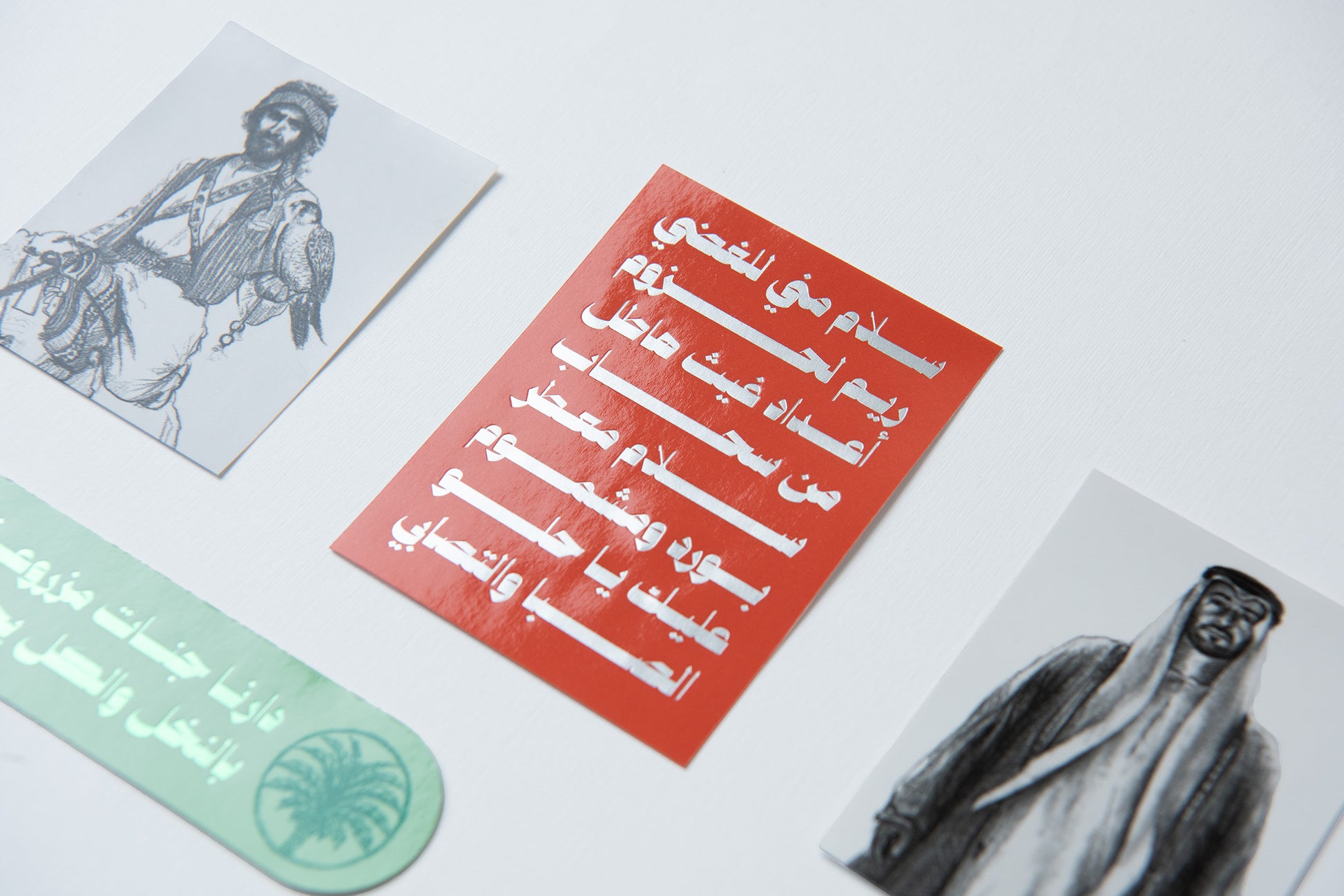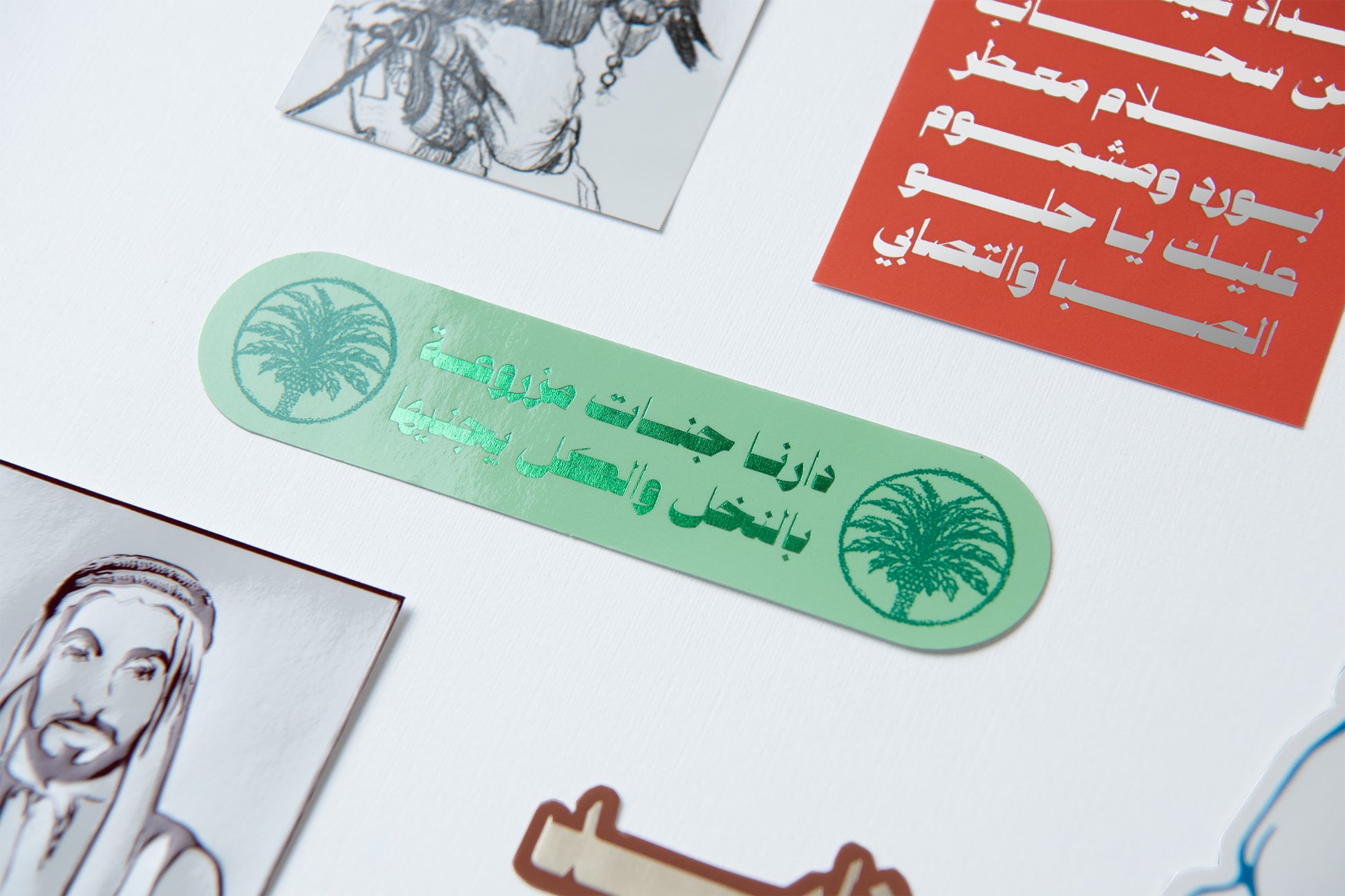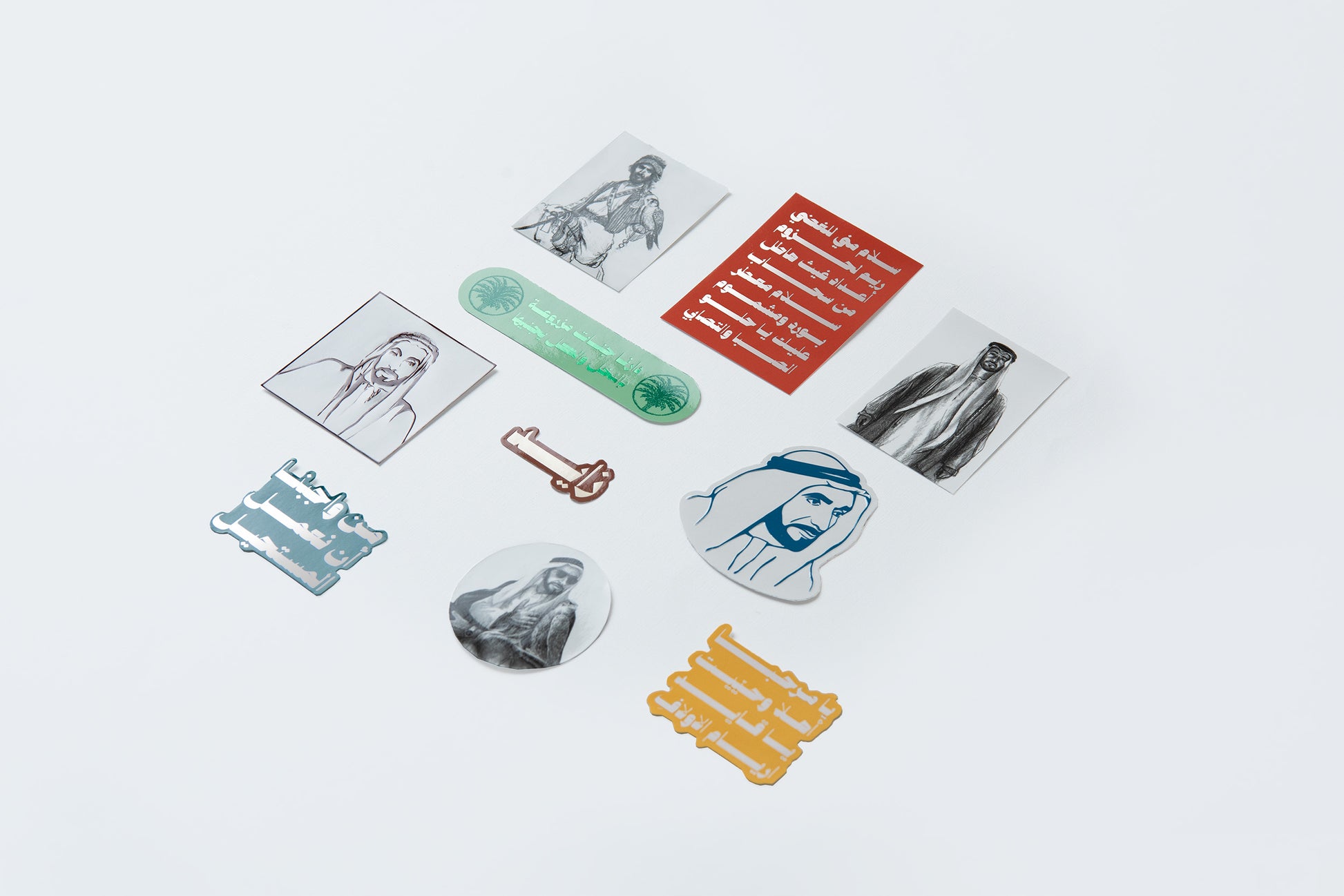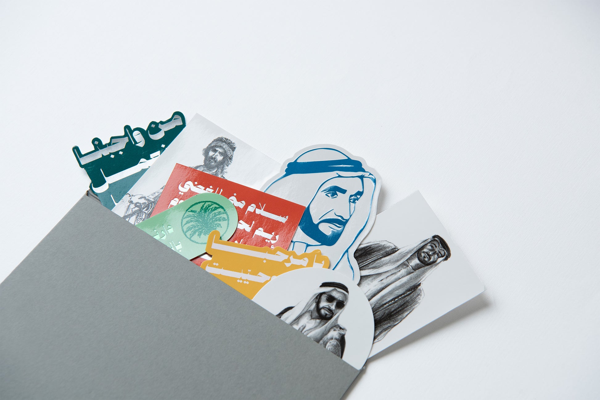 Set of 10 paper stickers portraying the Founding Father, the late Sheikh Zayed bin Sultan Al Nahyan through hand drawn artworks and quotes. The collection of stickers depicts embossing and gold foiling elements.